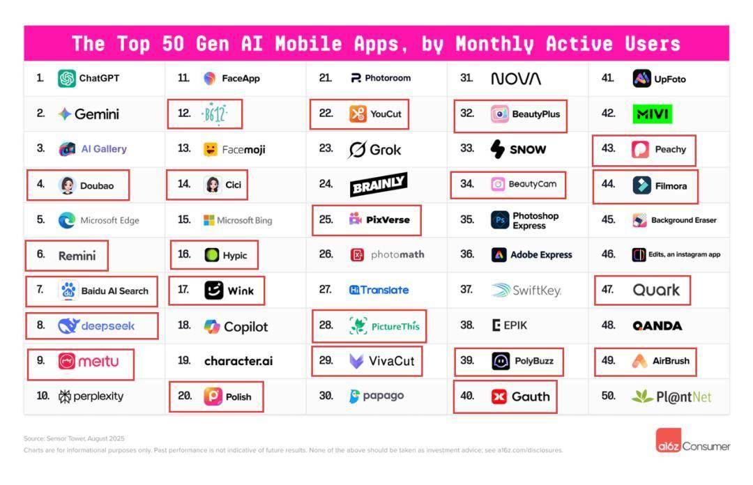 在美国著名风投机构A16Z每一季度评选的产品榜单上,2025年8月,移动端Top50的中国AI应用有22款——但一年半之前,同样榜单上的中国AI应用数量不到10个。