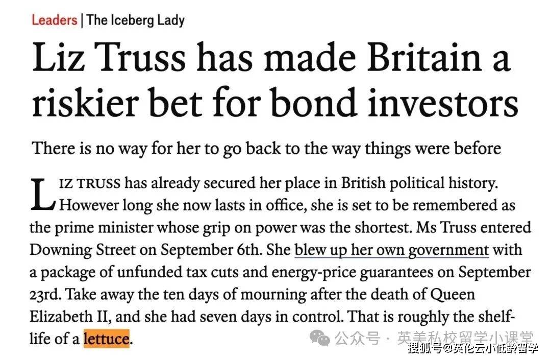 一语成谶,特拉斯的首相生涯不仅不到七七四十九天,在她自己推动灾难性预算案后撑着不下台的时间输给了《每日星报》从Tesco买来的一颗新鲜生菜的保质期。