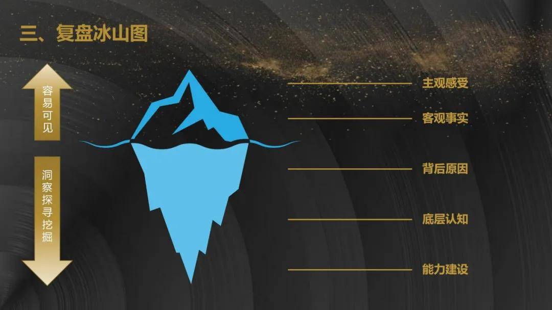 复盘不是 “绩效考核的附属品”,而是 “将个人经验转化为组织能力”的关键环节。他借助“复盘冰山图”说明,有效的复盘需要穿透“主观感受”与“客观事实”,深入挖掘“背后原因”“底层认知”以及“能力建设”三个层面。