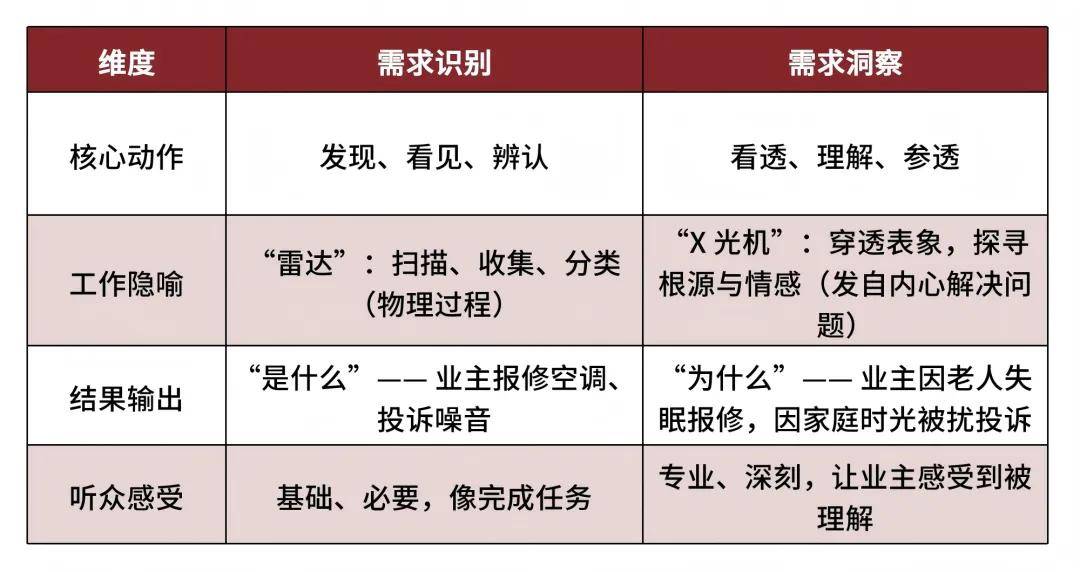 价值假设的核心是“需求洞察”,而非仅“需求识别”。物业行业常将“业主报修空调”“投诉噪音”等视为需求,却忽略背后真实动机:报修空调可能因老人高温失眠,投诉噪音实为周末家庭时光受扰。