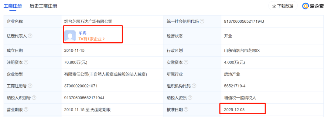 12月2日,据爱企查显示,烟台芝罘万达广场有限公司发生工商变更,新华保险旗下坤华(天津)股权投资合伙企业(有限合伙)、坤元辰兴(厦门)投资管理咨询有限公司退出股东行列,大连万达商管旗下上海万达锐驰企业管理有限公司成为新的全资股东,吴华成为新的法定代表人。