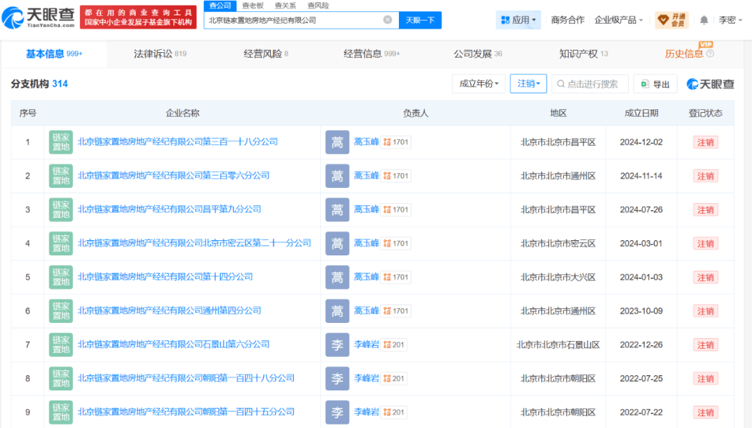 据天眼查显示,近日,北京链家置地房地产经纪有限公司丰台区第六十分公司、北京链家置地房地产经纪有限公司第三百零六分公司、北京链家置地房地产经纪有限公司第三百一十八分公司、北京链家置地房地产经纪有限公司顺义第八十八分公司、北京链家置地房地产经纪有限公司丰台第六十三分公司登记状态由存续变更为注销,负责人均为蒿玉峰,注销原因为隶属(派出)企业终止。