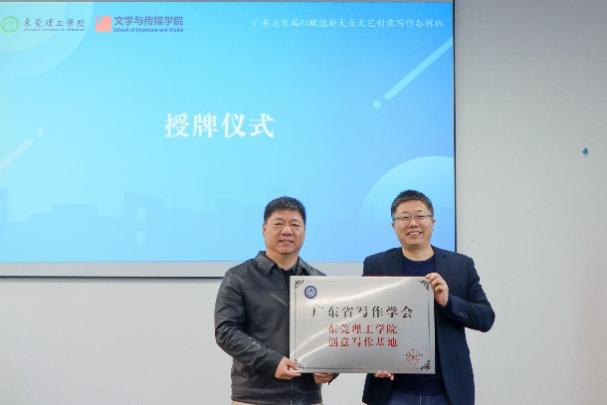 随后,文学与传媒学院党委书记阎江为广东省写作学会会长、暨南大学教授胡伟颁发客座教授聘书,胡教授向学院捐赠其主编的《人工智能辅助写作丛书》及自传体长篇小说《我们在路上》。现场,“广东省写作学会东莞理工学院创意写作基地”同步正式揭牌,标志着校地协同推动创意写作学科发展、服务新大众文艺创作迈入了新阶段。